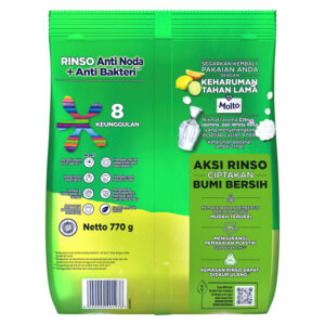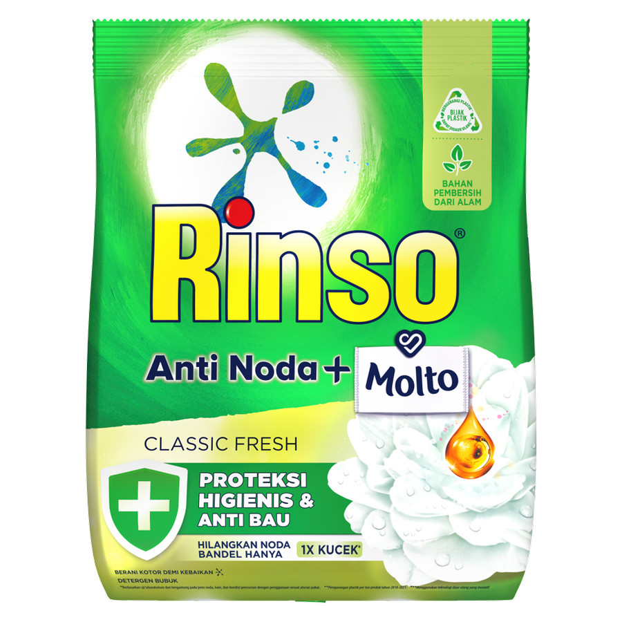 Rinso Molto Deterjen Bubuk Pertama Bunuh VIRUS! Kini hadir dengan formulasi 3X lebih efektif Angkat Noda dan bunuh 99.99% BAKTERI & VIRUS SARS-CoV 2. Hilangkan noda bandel hanya dengan 1X Kucek. Deterjen bubuk Rinso BARU dilengkapi teknologi anti residu yang menjaga pakaian tetap cemerlang. Detergen pengharum varian ROSE FRESH memberikan keharuman menyenangkan Rose dan Apel Merah yang tahan hingga 21 hari. Bahan pembersih terbuat DARI ALAM menjaga tangan tetap lembut & tidak panas. Anti Noda, Anti Bakteri & Virus, Anti Bau Apek dengan Rinso Deterjen Bubuk. Tersedia juga dalam deterjen cair dan telah tersertifikasi halal.