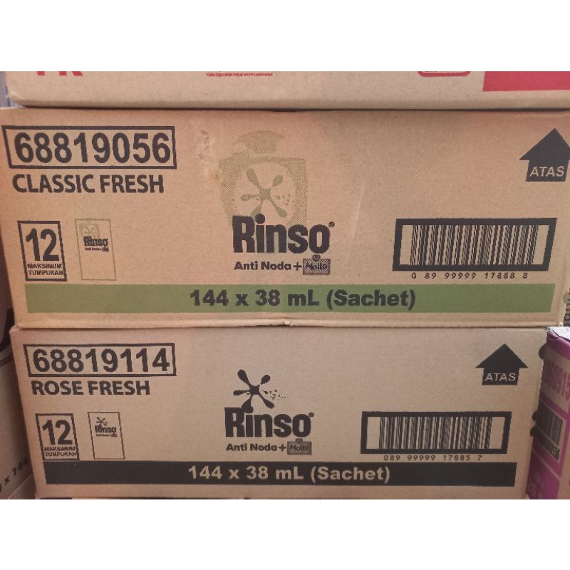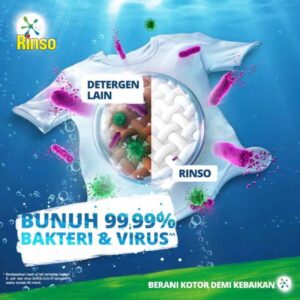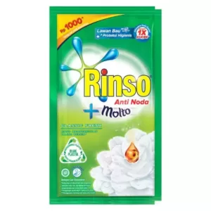 Rinso merupakan salah satu merek detergen yang tentunya sudah tidak asing di telinga Anda. Selain mempunyai kualitas yang sangat baik, detergen ini juga mampu membersihkan pakaian hanya dengan 1x kucek. Maka tidak heran, jika hingga saat ini detergen Rinso banyak diminati oleh masyarakat. Detergen cair ini mengadung formula yang dapat membunuh bakteri dan virus. Tidak hanya itu saja, Rinso juga terbukti ampuh dapat menghilangkan noda membandel serta adanya proteksi higienis untuk melindungi pakaian dari bakteri dan bau tak sedap. Selain itu, detergen ini dilengkapi teknologi anti residu yang menjaga warna pakaian tetap cemerlang. Kandungan formula didalamnya yang dikombinasikan dengan molto detergen mampu merawat pakaian dan menjadikan pakaian tetap lembut. Menariknya lagi, Rinso memiliki berbagai varian aroma yang dapat tahan lama hingga 21 hari, diantaranya tersedia Rinso detergen cair dengan aroma Rinso Molto Japanese Peach, Rinso Molto Royal Gold, Rinso Molto Rose Fresh, Rinso Anti Noda Classic Fresh dan Rinso Molto Perfume Essence.
